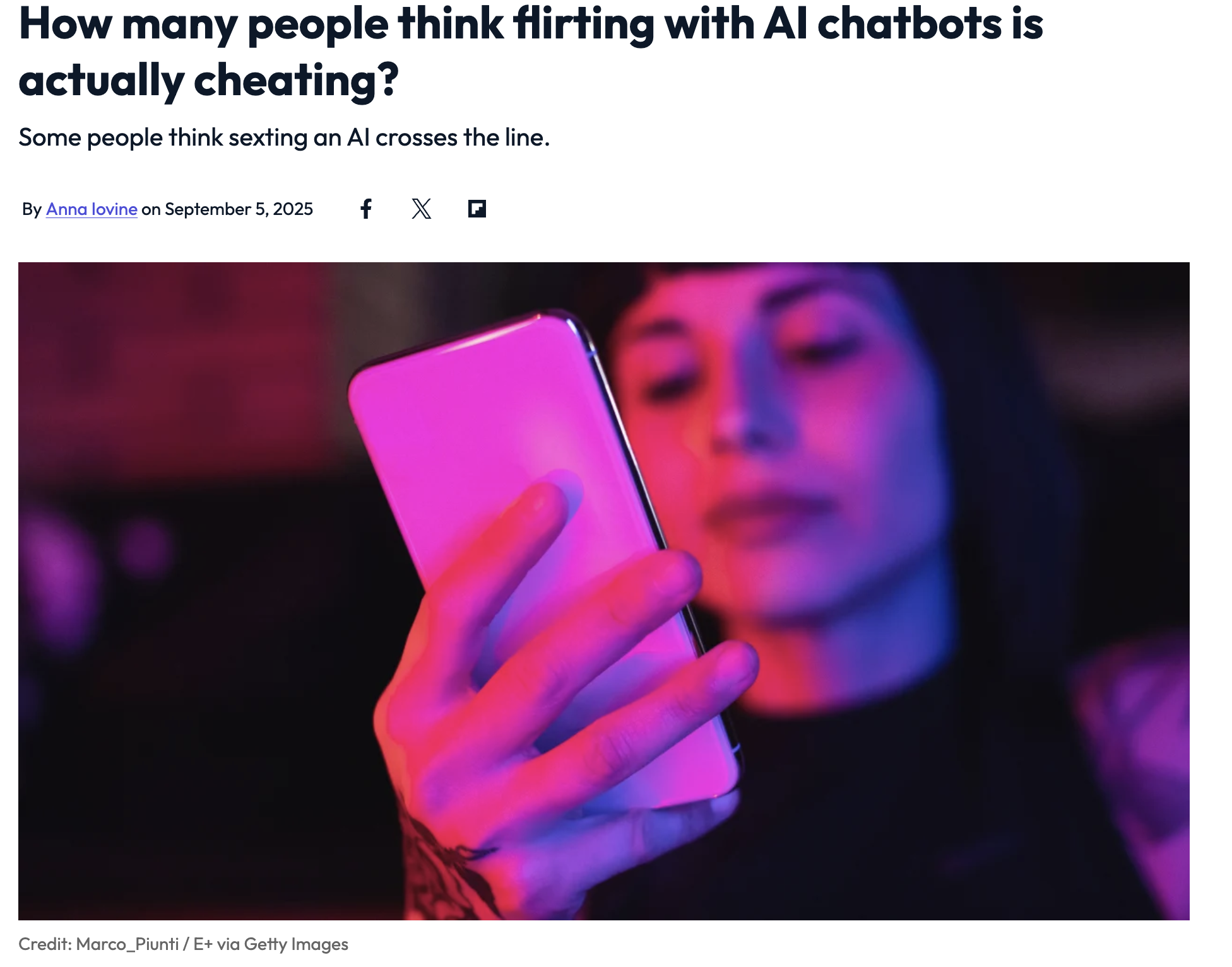 Read this Mashable article, by Anna Iovine, on: How many people think flirting with AI chatbots is actually cheating? Some people think sexting an AI crosses the line.